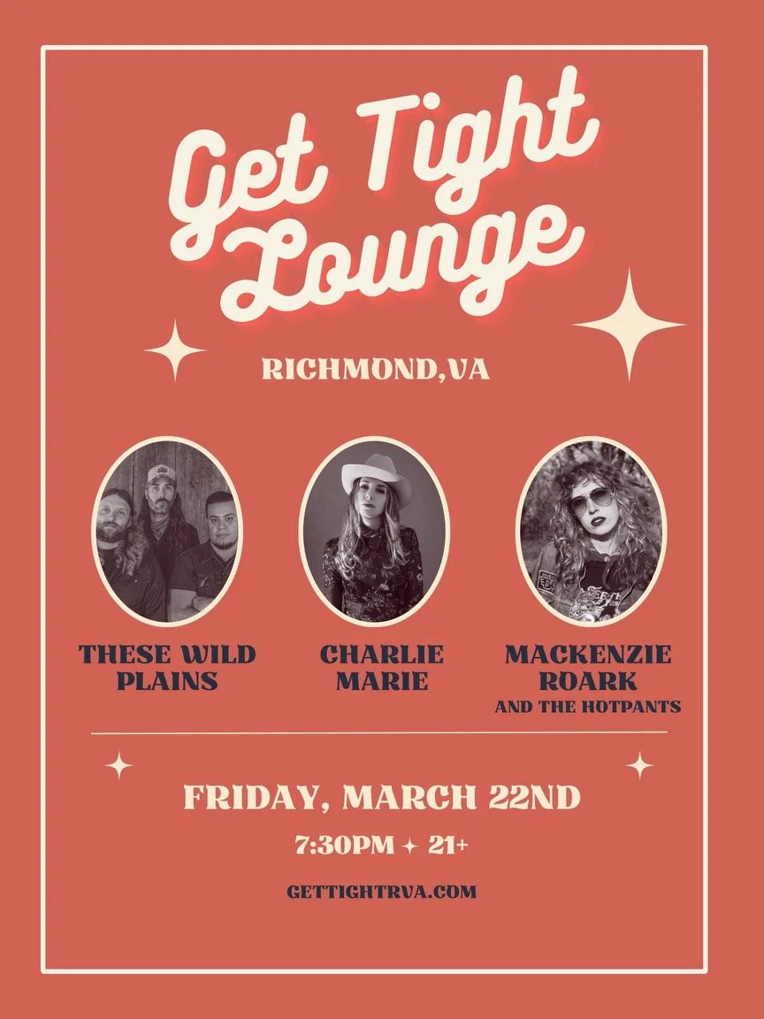 These Wild Plains w/ Charlie Marie & Mackenzie Roark And The Hotpants Friday, March 22, 2024 7:00 PM 11:55 PM Get Tight Lounge 1104 W Main St Rich Richmond, VA 232200 (map) Google Calendar ICS Get Your TICKETS Here!